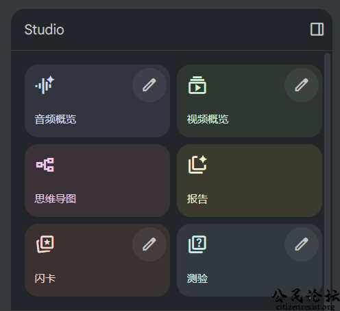 使用自动功能: 当你上传来源后,NotebookLM 会在聊天框上方显示一系列自动化功能按钮,点击即可一键生成对应内容。